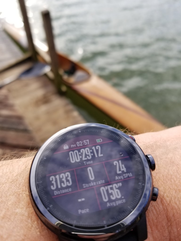 I’ve been using the Amazfit Stratos for the past week and I love it. It has an always-on display that is brighter and easier to read in bright sunlight, has GPS, is waterproof and also can provide data and statistics for kayak strokes. If you put this watch into “Open water swimming mode” it keeps track of your strokes.