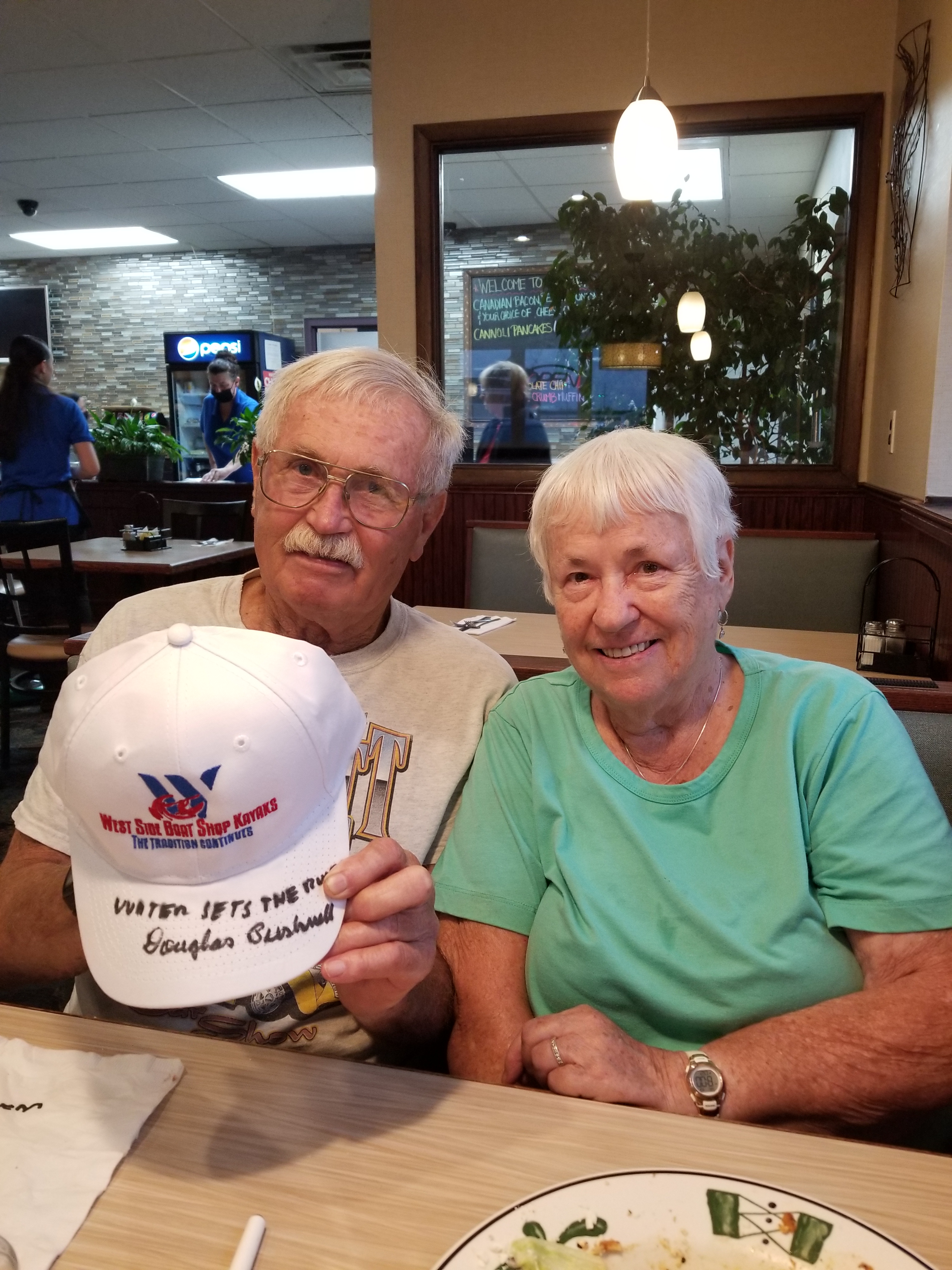 Doug Bushnell and his girlfriend Beth as he autographed a hat for me that read, “Water sets the rules.”